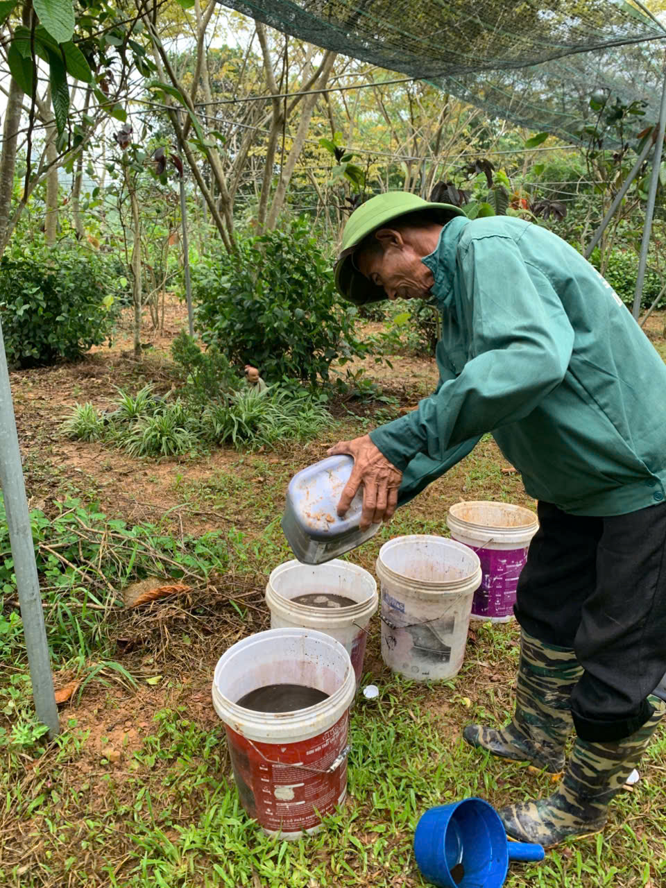05-04-2025 12:04:00 | Bón Thúc | Tiến hành bón phân cho cây Trà Hoa Vàng. Sử dụng phân hữu cơ LUCAVI dạng dung dịch - Lượng bón: • Cây nhỏ: tưới 100ml dung dịch phân bón • Cây nhỡ: tưới 150ml dung dịch phân bón - Cách bón: Tưới gốc dung dịch phân bón đậm đặc, sau đó tưới nước để phân ngấm dần vào đất. Đặc biệt tận dụng bón phân vào khoảng thời tiết độ ẩm cao giúp giảm thiểu thất thoát phân bón và công sức của người lao động, cây cũng hấp thụ tối đa lượng phân bón. Tổng dung lượng bón là 175 lít dung dịch Lucavi. | Hoàn thành | |